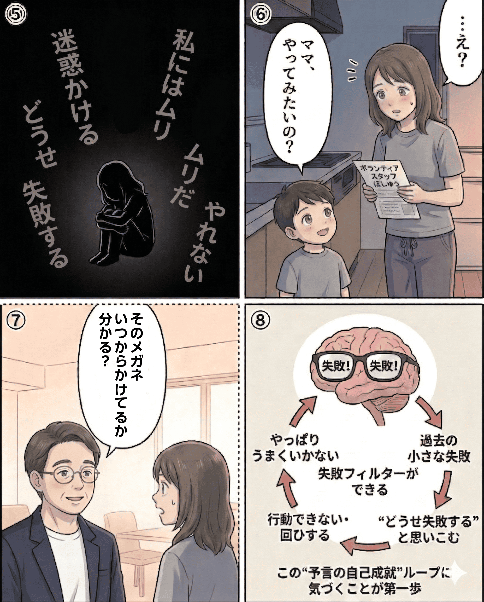過去の小さな失敗→失敗フィルターができる→「どうせ失敗する」と思いこむ→行動できない・回避する→「やっぱりうまくいかない」——この“予言の自己成就”ループに気づくことが第一歩。