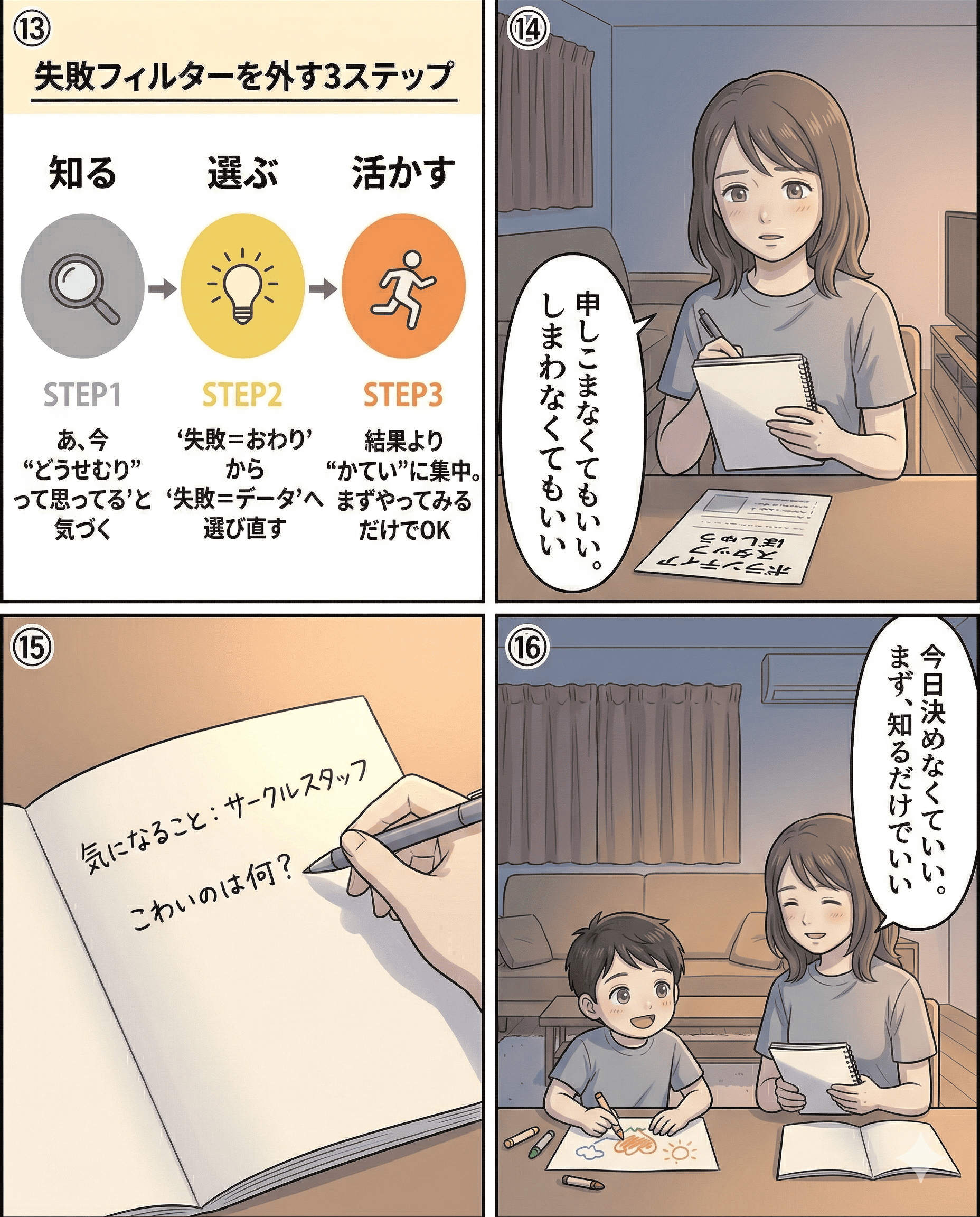 「チラシをしまい込んだら、また後悔するかもしれない」「でも今すぐ決断しなくても、まず書き出すだけなら怖くない」——行動の結果を手前から丁寧に想像することで、自分が本当に動ける一歩を選べるようになる。それが「失敗フィルターを外す3ステップ」の核心にある力なんですよね。