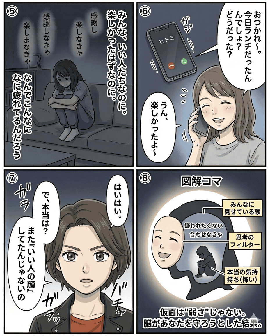 仮面の図解が浮かび上がります——みんなに見せている笑顔の下に、「嫌われたくない」「合わせなきゃ」という思考フィルターがあって、その奥にぼろぼろの本当の気持ちが隠れている。