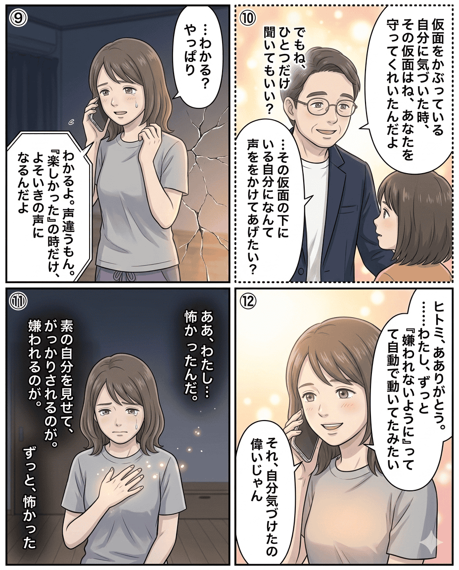 でもヒトミの問いかけをきっかけに、「怖かったんだ」と正確な感情に名前をつけ、「仮面はあなたを守ってくれていた」と捉え直した。