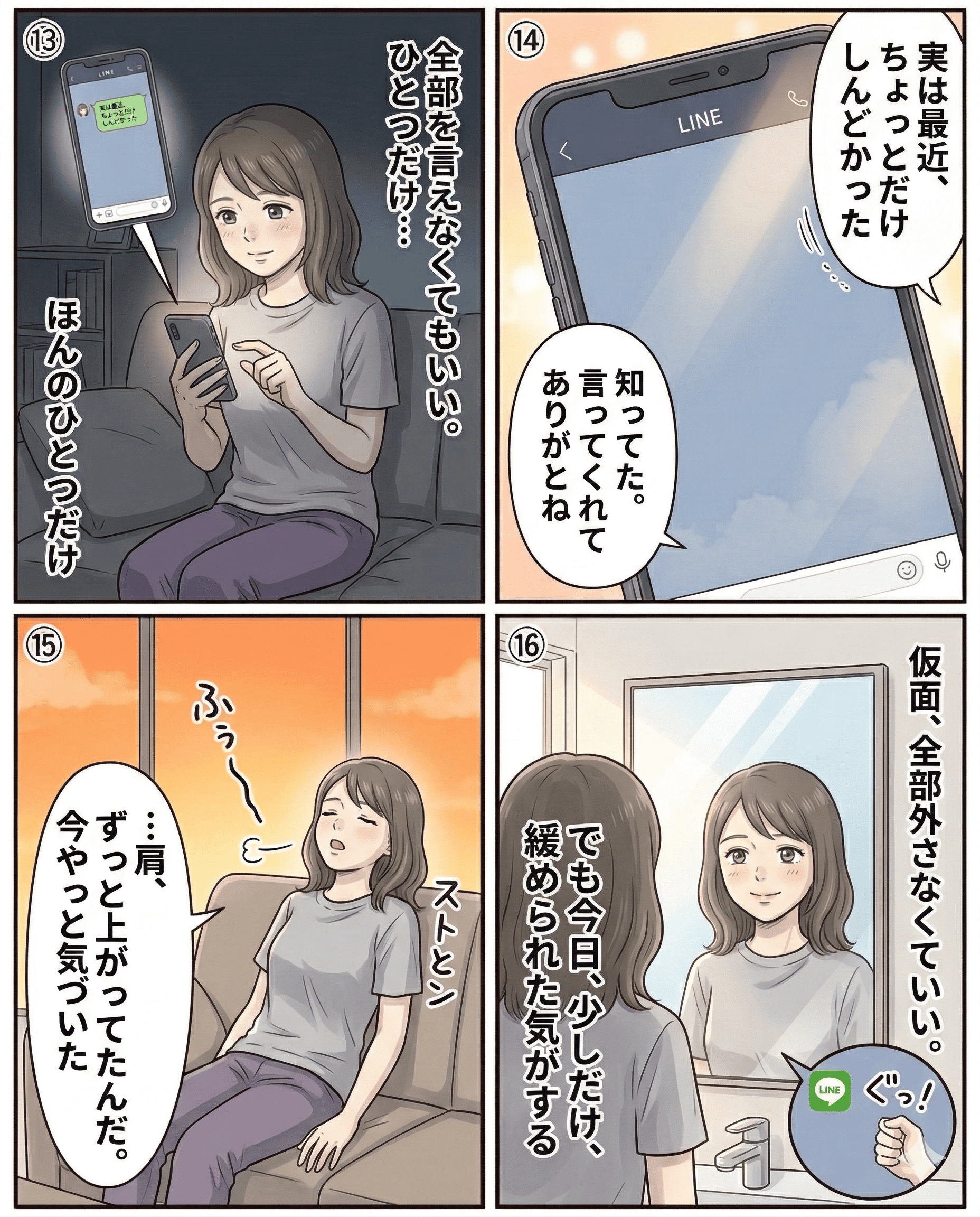 「仮面、全部外さなくていい。でも今日、少しだけ、緩められた気がする」