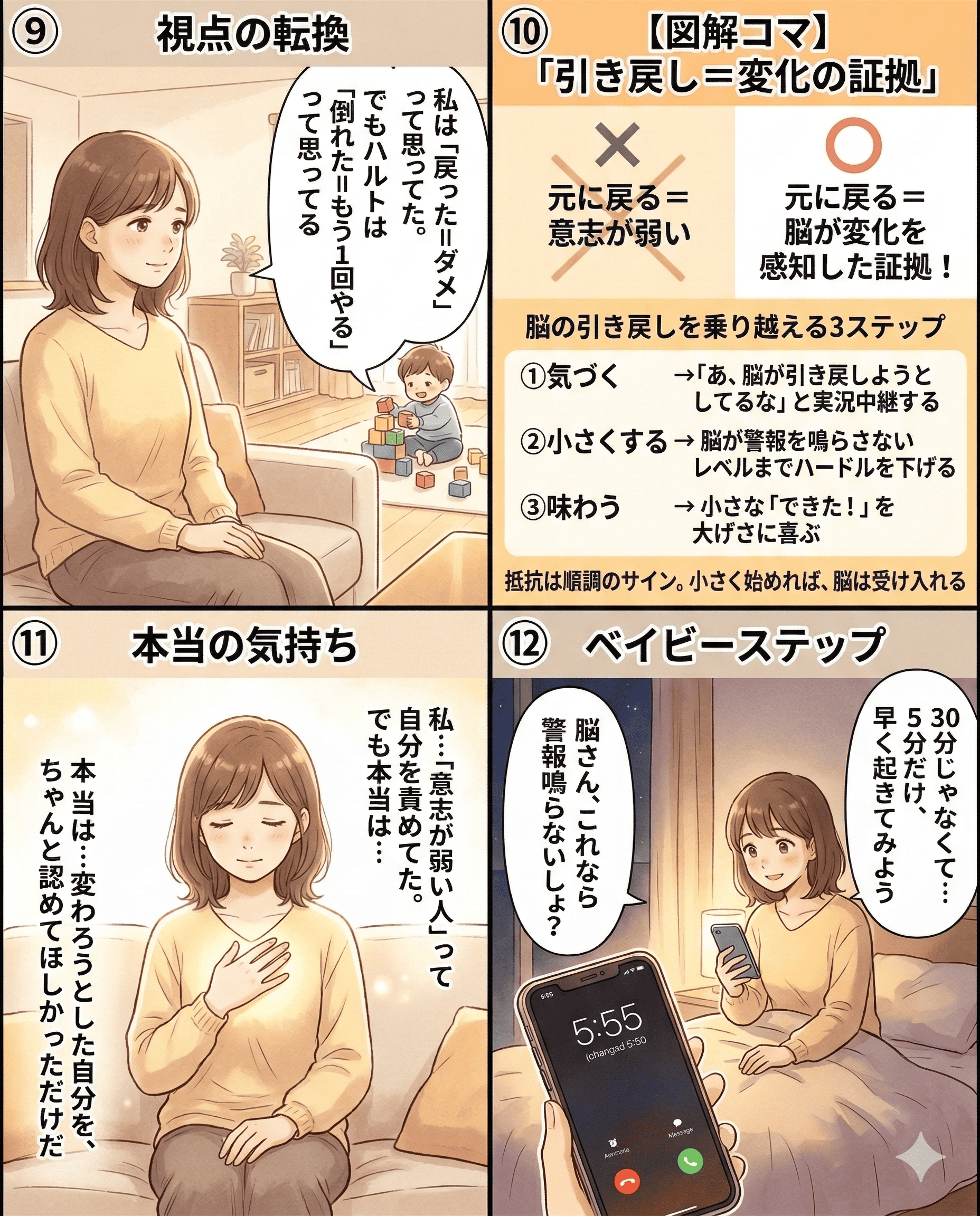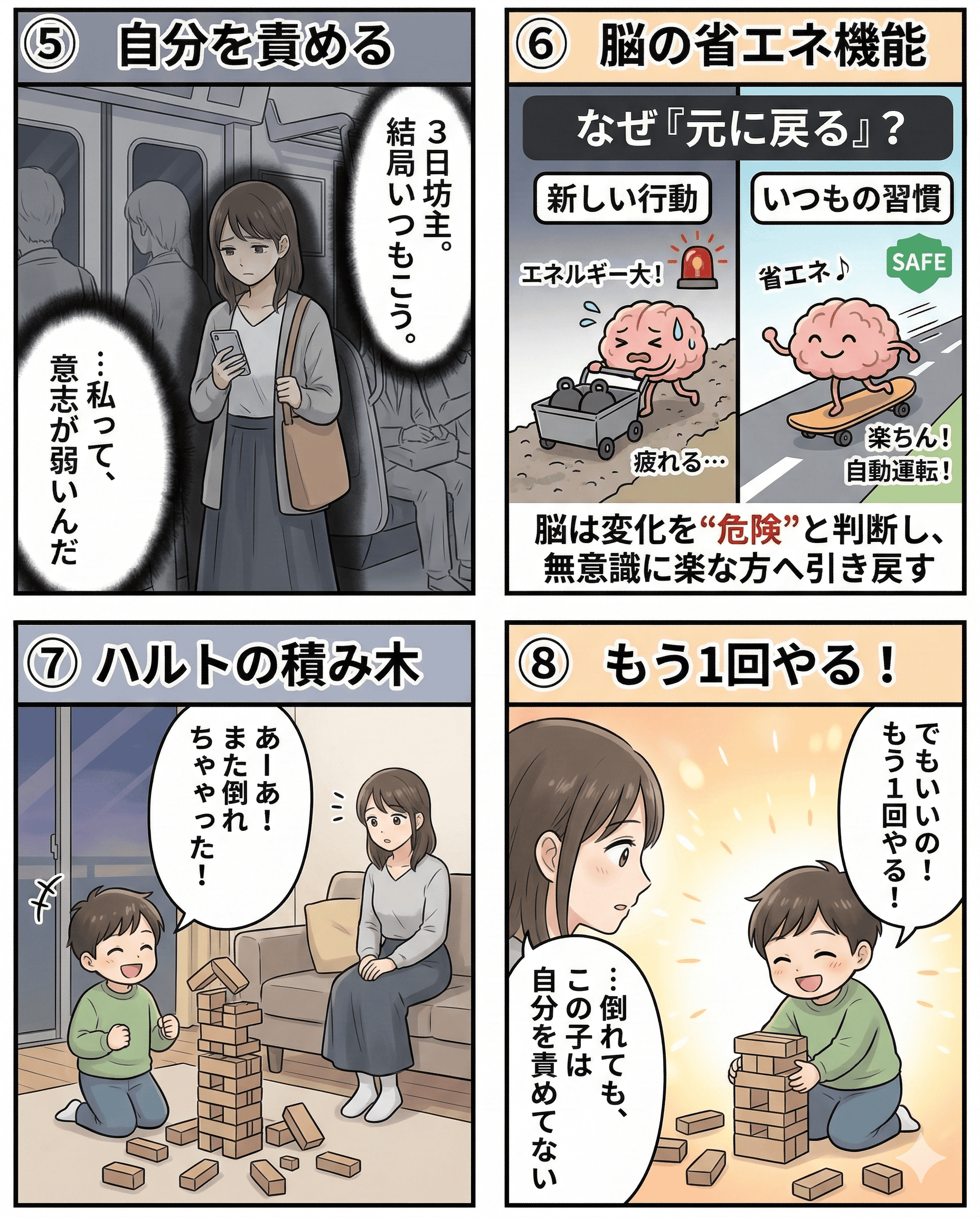 変わろうと努力するも元に戻る心の葛藤を描いた漫画シーン.