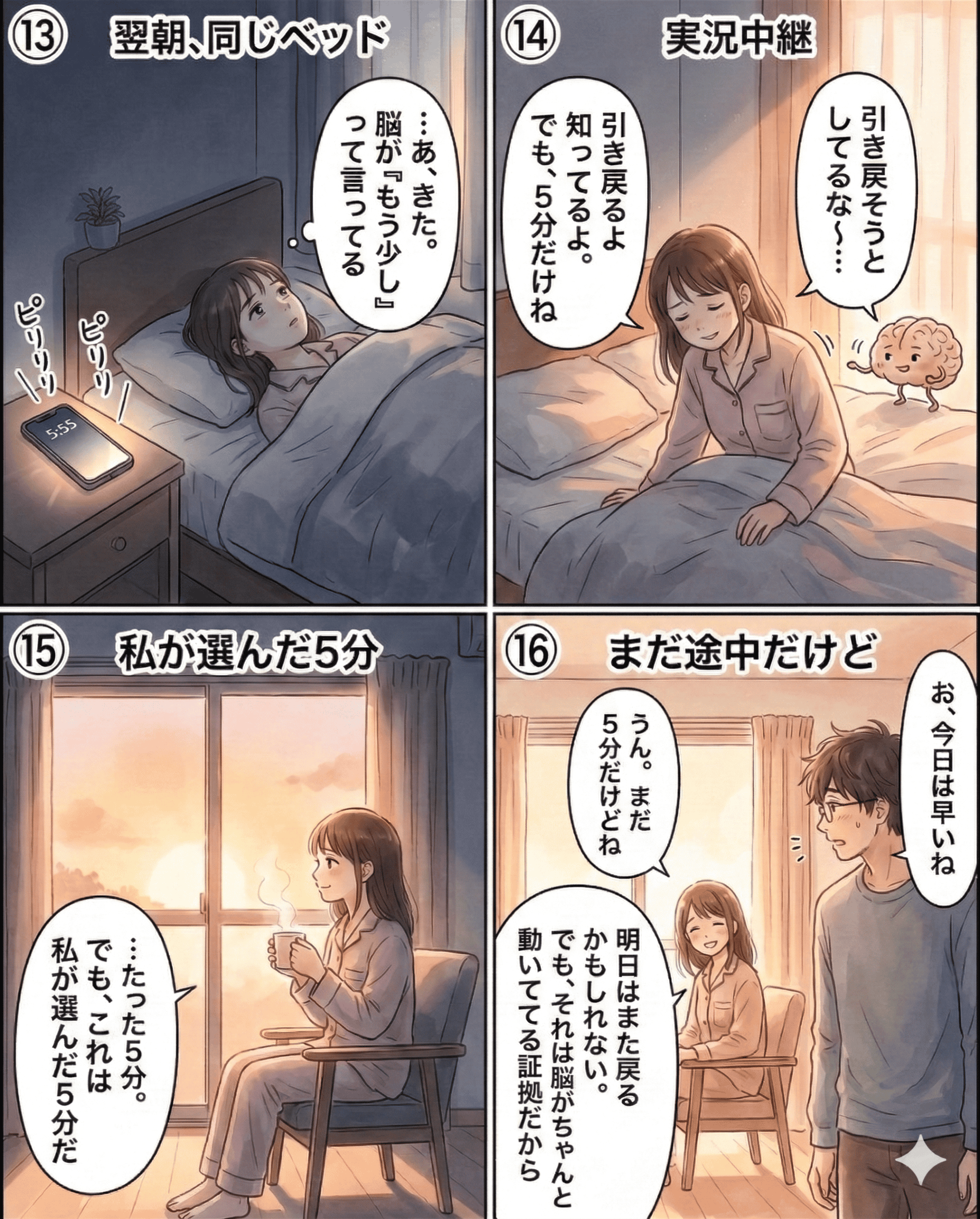 【シーン3】「5分だけ早く起きてみよう」——脳に小さく約束した夜