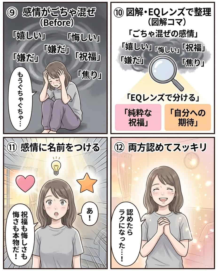 「嬉しい、悔しい、嫌だ、祝福、焦り」がひとかたまりでぐちゃ混ぜになっていた状態から、「純粋な祝福」と「自分への期待」というふたつの言葉に整理できた瞬間——これがまさに感情リテラシーの発揮でした。